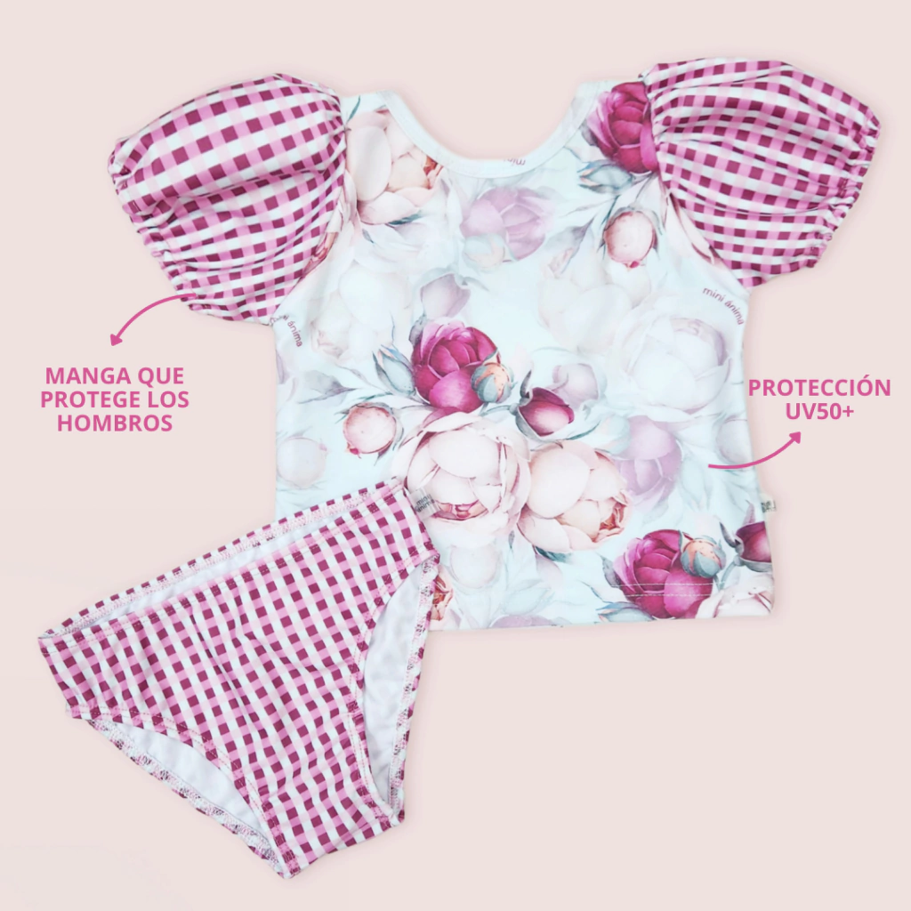 - Diseño: El Conjunto Balloon UV es un traje de baño de dos piezas estampadas con colores en composé. Además, el bullone de los hombros y el detalle del moño en la espalda de la remera, agregan delicadeza y belleza para que el Traje de Baño de tu Mini sea súper exclusivo.