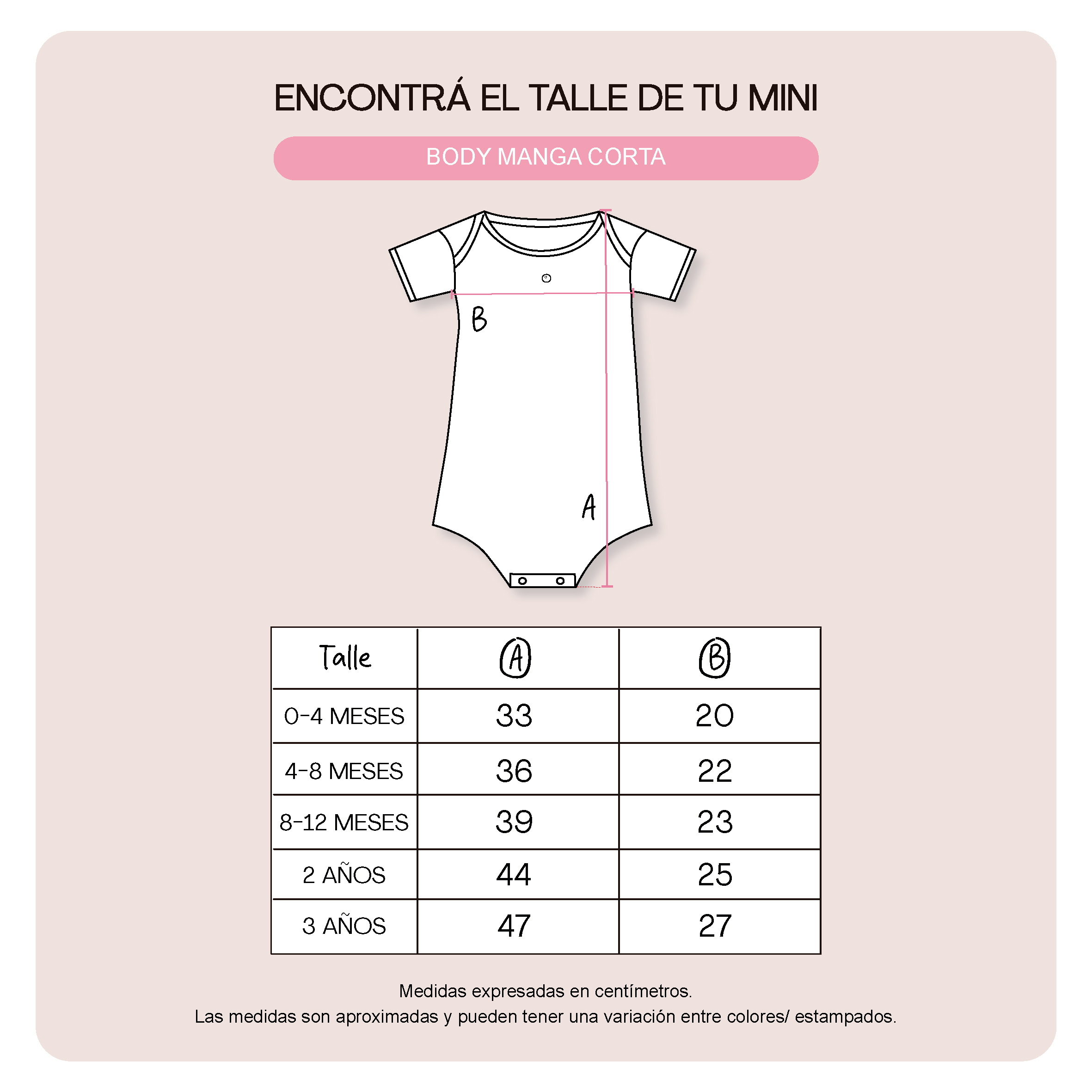- Guía de talles: Podés utilizarla para comparar con las medidas de alguna prenda de tu bebé. Al tratarse de prendas con procesos manuales puede haber una mínima diferencia entre el producto y la tabla.