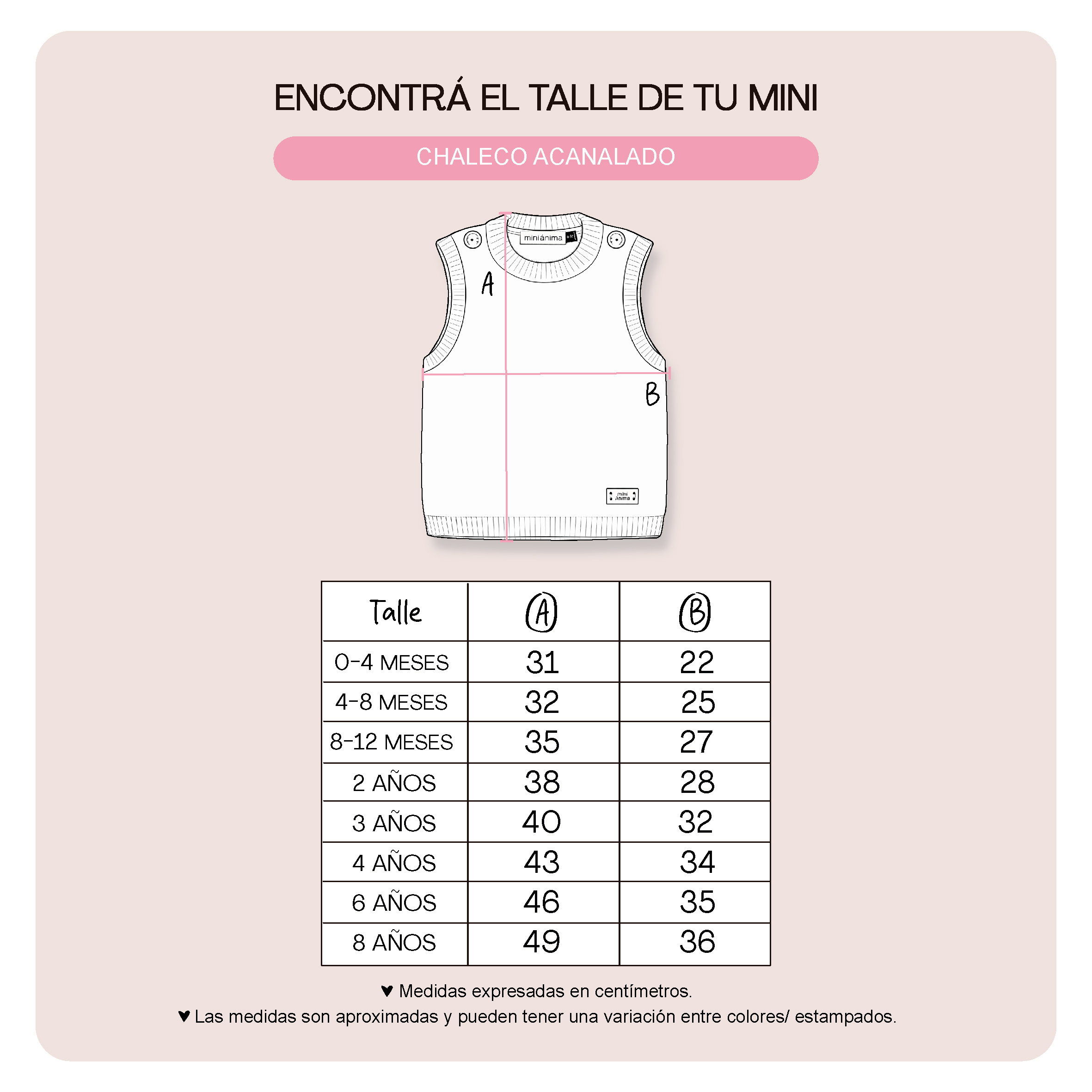 Guía de talles: Podés utilizarla para comparar con las medidas de alguna prenda de tu bebé. Al tratarse de prendas con procesos manuales puede haber una mínima diferencia entre el producto y la tabla.