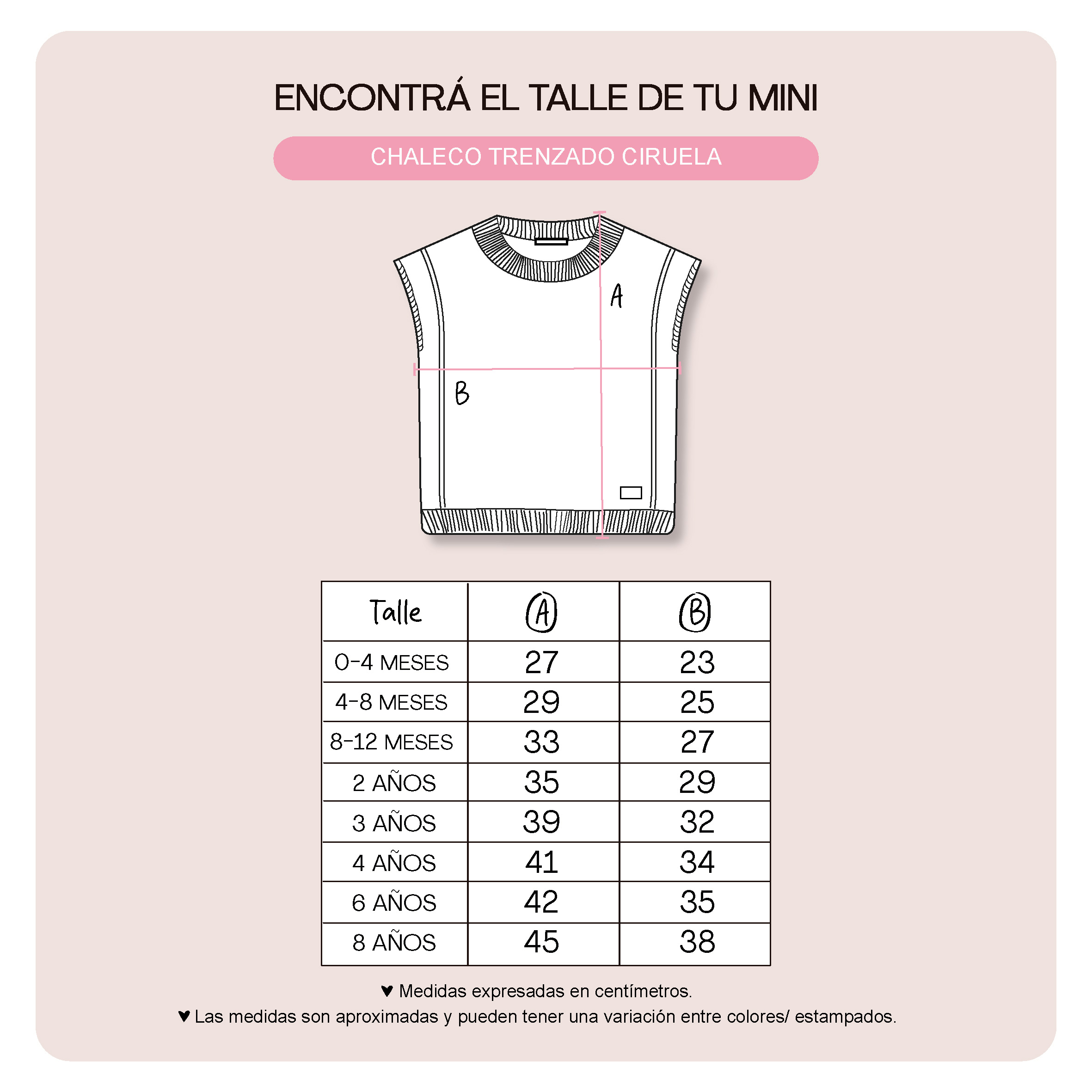 Guía de talles: Podés utilizarla para comparar con las medidas de alguna prenda de tu bebé. Al tratarse de prendas con procesos manuales puede haber una mínima diferencia entre el producto y la tabla.
