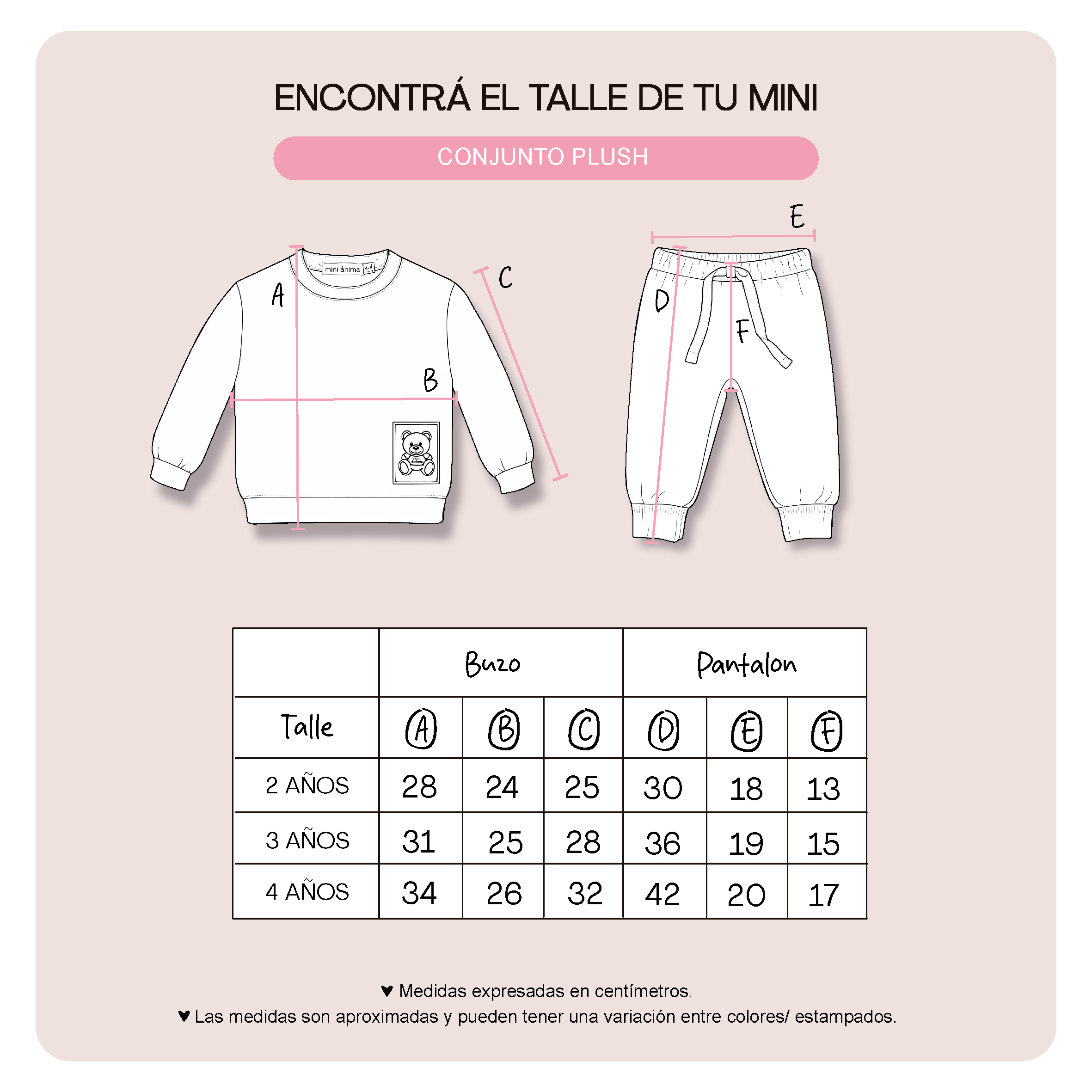 - Diseño: El conjunto incluye buzo y jogger, logrando un look cómodo y práctico para todos los días. El plush aporta abrigo y suavidad, ideal para acompañar cada momento de tu Mini.