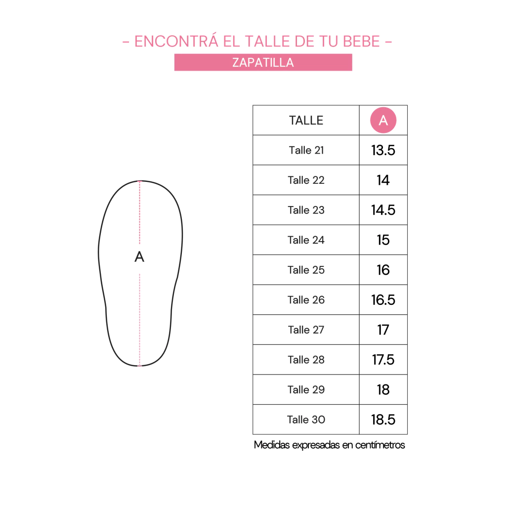 - Talles: Desde el talle 21 al 30. Abarcando aprox. desde el año hasta los 6 años.